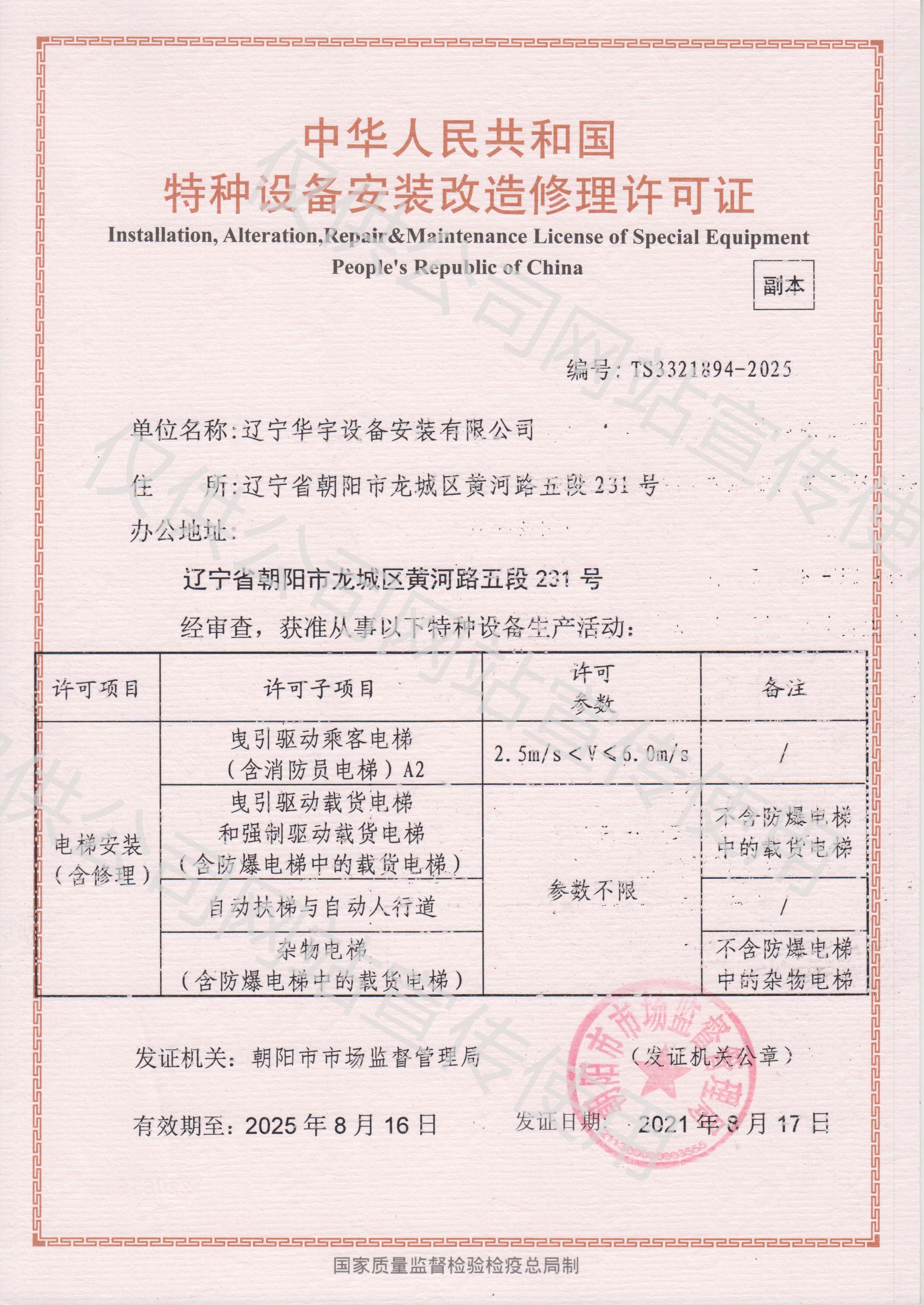 ? ? ? ?? 遼寧華宇設備安裝有限公司成立于2002年7月15日,注冊資金10000萬。公司占地面積60余畝,建筑面積4000余平?,F取得消防設施工程專業(yè)承包一級資質、消防設施維護保養(yǎng)檢測一級資質、建筑機電安裝工程專業(yè)承包一級資質、電子與智能化專業(yè)承包二級、建筑裝修裝飾工程專業(yè)承包二級、安全技術防范設施設計施工二級資質、建筑工程施工總承包三級、電力工程施工總承包二級、輸變電工程專業(yè)承包二級資質、電力承裝、承修、承試三級資質、鋼結構工程專業(yè)承包三級資質和地基基礎工程專業(yè)承包三級。同時是人防工程通風(防化)設備生產安裝企業(yè),并具備電梯銷售、電梯安